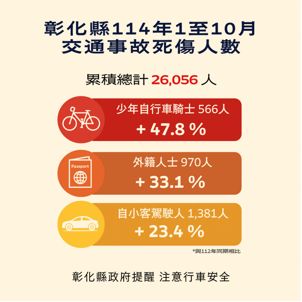 本縣114年1-10月道路交通事故死傷累計26,056人,請民眾注意交通安全。